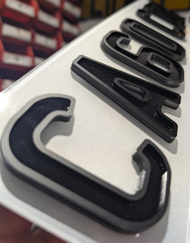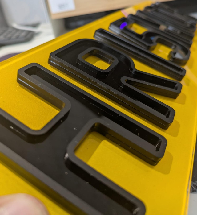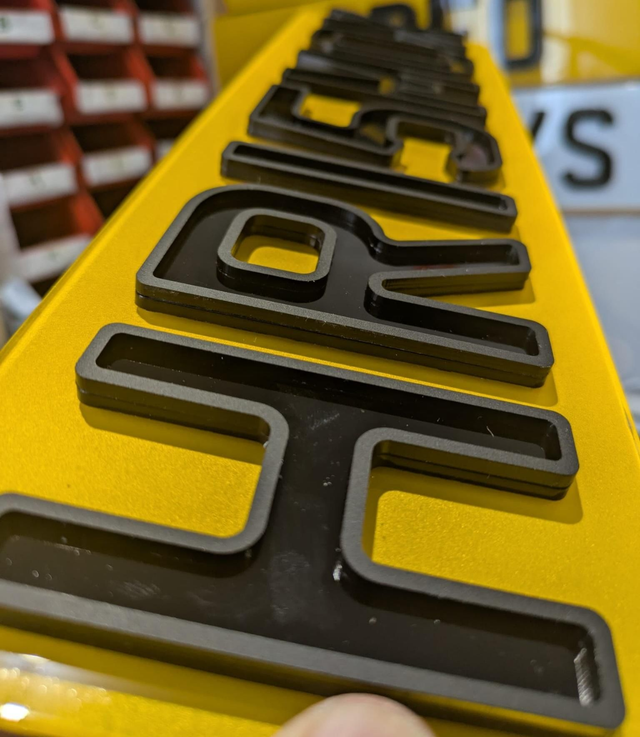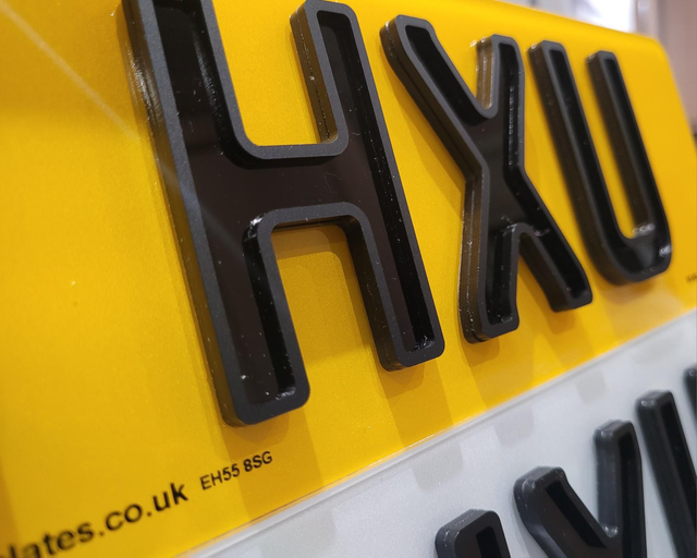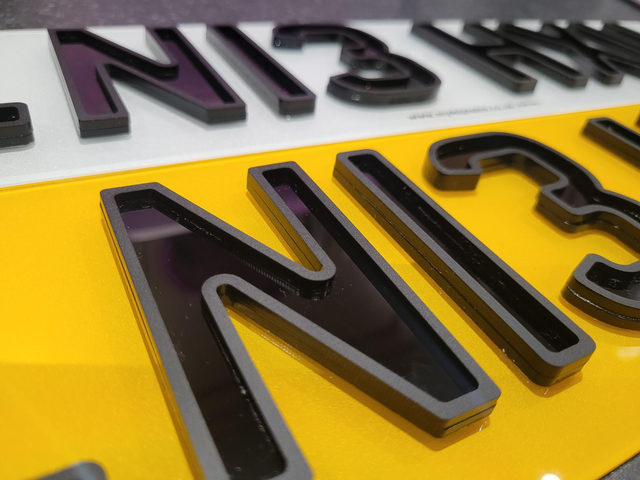 6mm 2 tone black 4D with Matte Black ghost outline. Road Legal Plates come with Company Name, Post Code and New 145e BS number. Plates available in standard size (520x111), 7-Digit (440x111), 6-digit (399x111), 5-digit (330x111), Hex lambo style in 7, 6 and 5 digit size and also 21x6 Range Rover/Jaguar rear plate and 11x8 Land Rover rear plate. Tinted plates also available but these will not have bs numbers so wont be road legal.